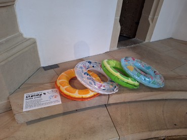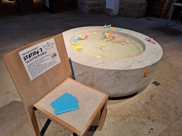 Nach dem ersten Teil der Geschichte ging es für die Kinder in die Chaos-Zeit: Acht verschiedene Stationen luden zum Basteln, Spielen, Toben und Nachdenken ein. Da wurden „Steckentiere“ gebastelt und gleich in einem Parcours ausprobiert, Fische im Taufbecken geangelt, Postkarten an die „Heimat“ geschrieben oder Tiere gesucht, die sich in der Kirche versteckt hatten.