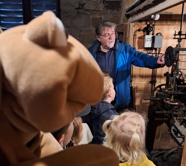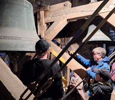 Oben angekommen gab es noch mehr zu entdecken: das große Uhrwerk und die Glocken. Ganz vorsichtig wurden sie angeschlagen – und wer genau hinhörte, konnte sogar das Lied „Stille Nacht“ erkennen.