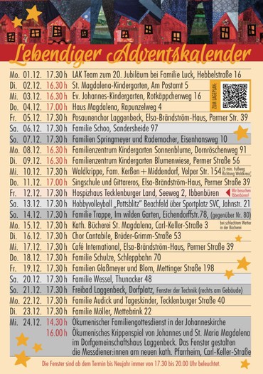 Täglich vom 1. bis 24. Dezember werden sich die Kläppchen in Laggebeck in der Regel um 17.30 Uhr öffnen. (Abweichungen sind möglich) und dazu beitragen, den eigentlichen Sinn von Advent ein wenig in Erinnerung zu bringen.