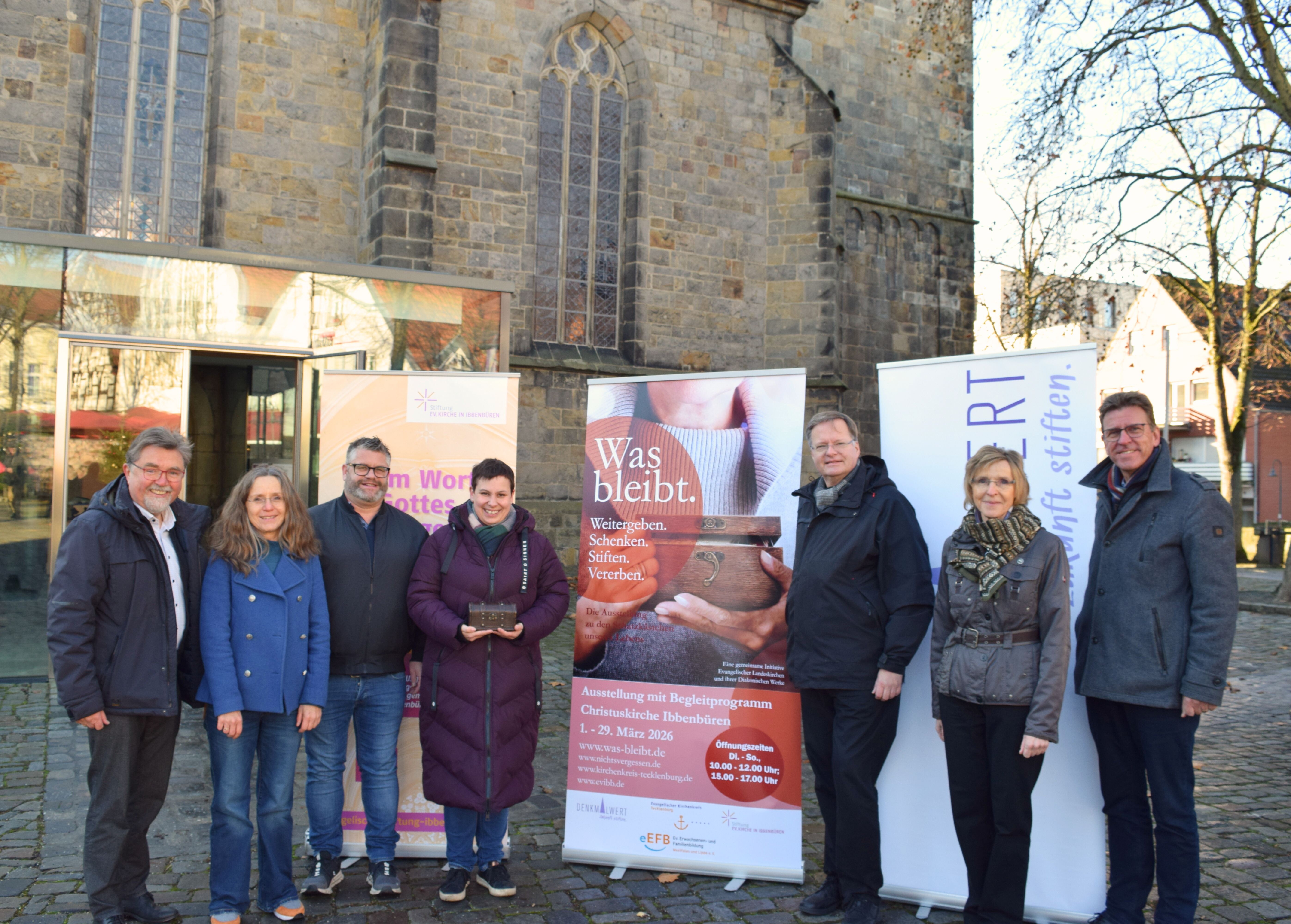 Sie freuen sich schon auf den Start der Ausstellung: Das Vorbereitungsteam vor der Christuskirche (v.l.:) Pfarrer i. R. Reinhard Lohmeyer, Pfarrerin Adelheid Zuehlsdorf-Meder, Markus Heinze, Pfarrerin Lena Stubben, Dr. Thorsten Jacobi, Marlies Beckemeyer und Superintendent André Ost. Foto: Christine Fernkorn.